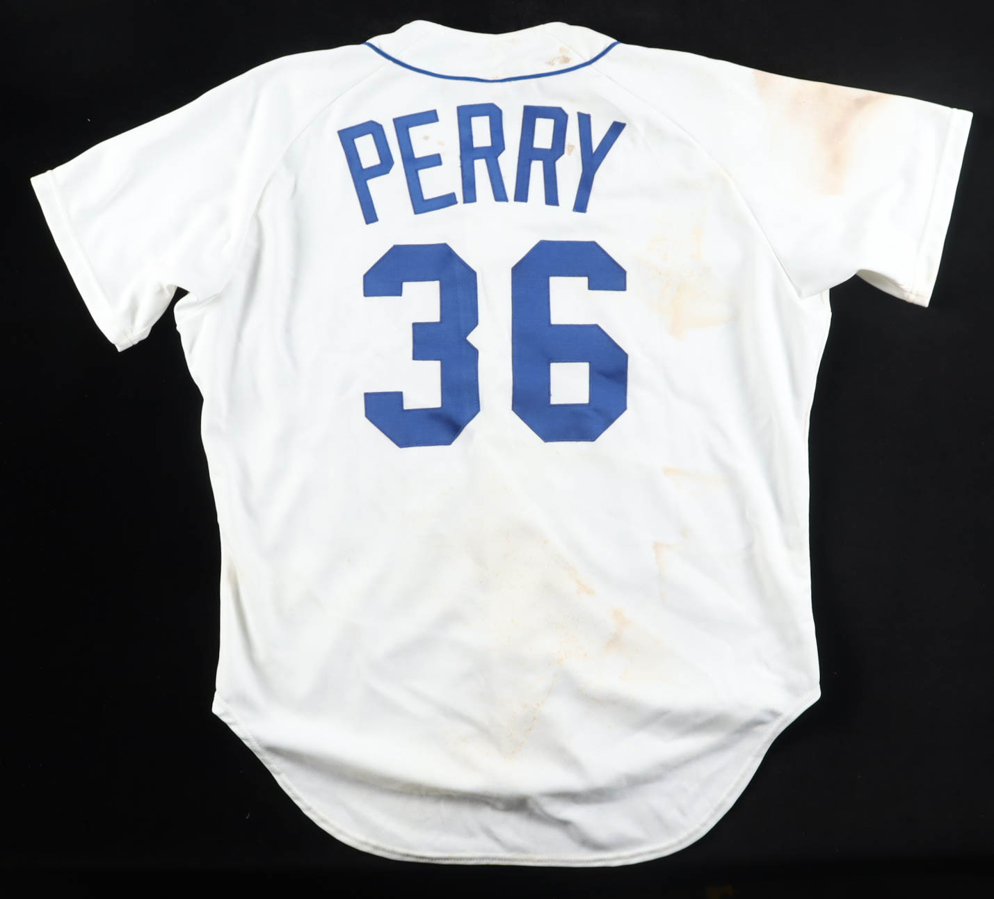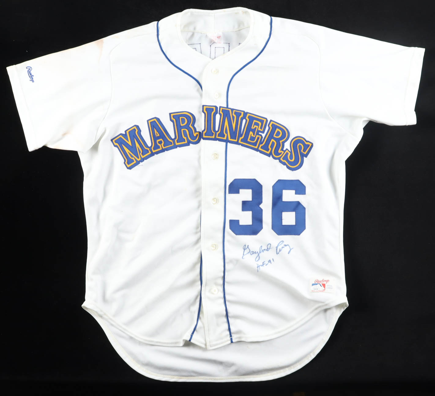Rawlings authentic jersey with everything sewn on, size 50. Hand-signed and inscribed by Gaylord Perry (Seattle Mariners, HOF). Please note, the jersey is heavily stained throughout and shows signs of age and wear. See photos for more detail regarding the condition of the item.