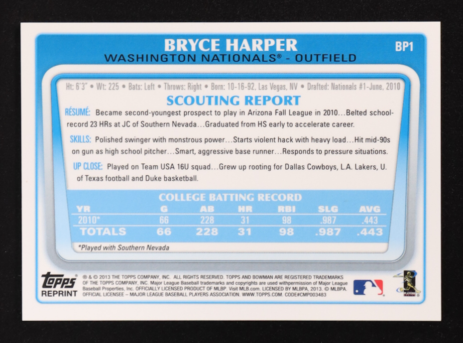 Bryce Harper 2013 Bowman Rookie Reprint Blue Sapphire Refractors #BP1