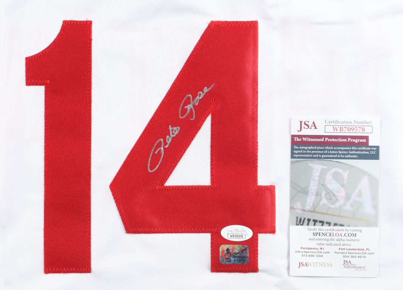 The lot / autograph(s) includes an official Pete Rose hologram from Fiterman Sports Group as well as an official James Spence Authentication (JSA) hologram and matching COA for authenticity purposes.