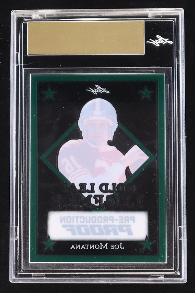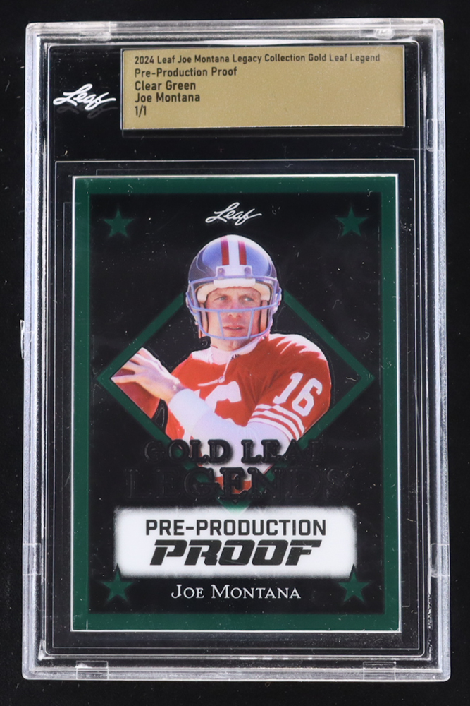 Joe Montana 2024 Leaf Joe Montana Legacy Gold Leaf Legends Pre-Production Proof Clear Green #NNO #1/1 (Leaf Encapsulated)