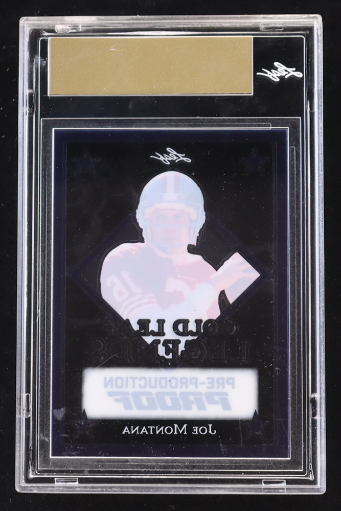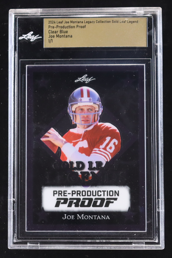 Joe Montana 2024 Leaf Joe Montana Legacy Gold Leaf Legends Pre-Production Proof Clear Blue #NNO #1/1 (Leaf Encapsulated)
