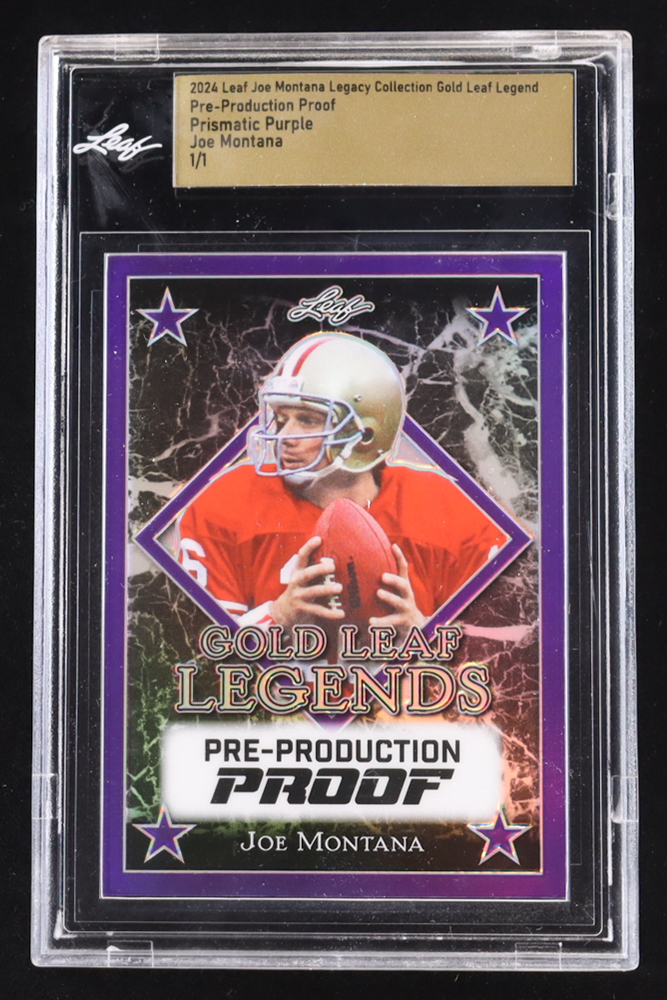 Joe Montana 2024 Leaf Joe Montana Legacy Gold Leaf Legends Pre-Production Proof Prismatic Purple #NNO #1/1 (Leaf Encapsulated)