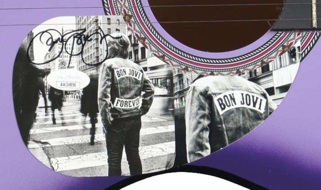 Guitar measures approximately 38" in length. Hand-signed on a CD cover that has been repurposed as a pick-guard by Jon Bon Jovi.