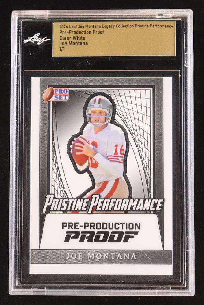 Joe Montana 2024 Leaf Joe Montana Legacy Pristine Performance Pre-Production Proof Clear White #NNO #1/1 (Leaf Encapsulated)