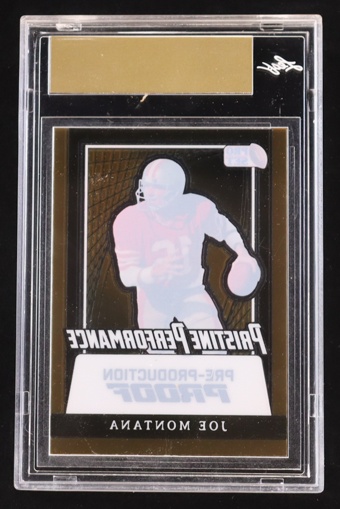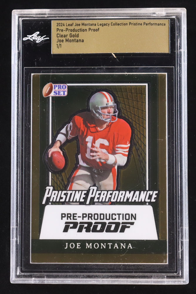Joe Montana 2024 Leaf Joe Montana Legacy Pristine Performance Pre-Production Proof Clear Gold #NNO #1/1 (Leaf Encapsulated)
