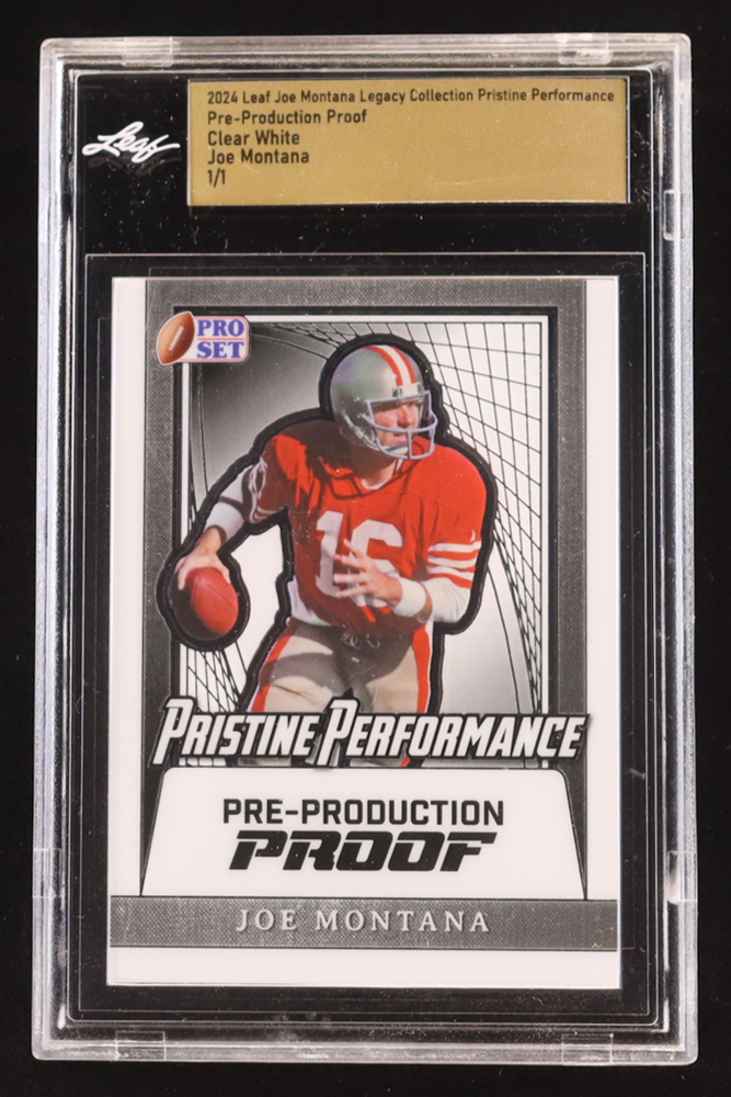 Joe Montana 2024 Leaf Joe Montana Legacy Pristine Performance Pre-Production Proof Clear White #NNO #1/1 (Leaf Encapsulated)