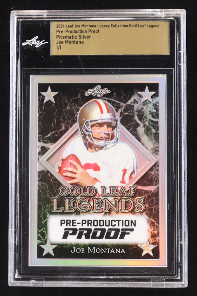Joe Montana 2024 Leaf Joe Montana Legacy Gold Leaf Legends Pre-Production Proof Prismatic Silver #NNO #1/1 (Leaf Encapsulated)