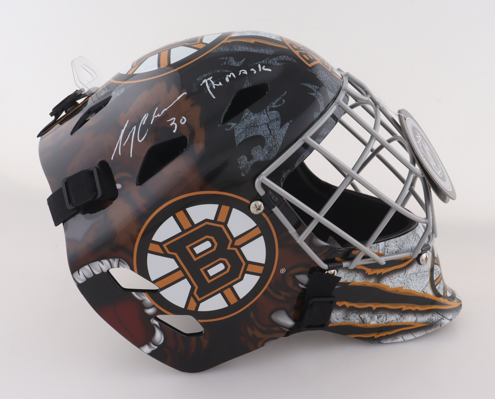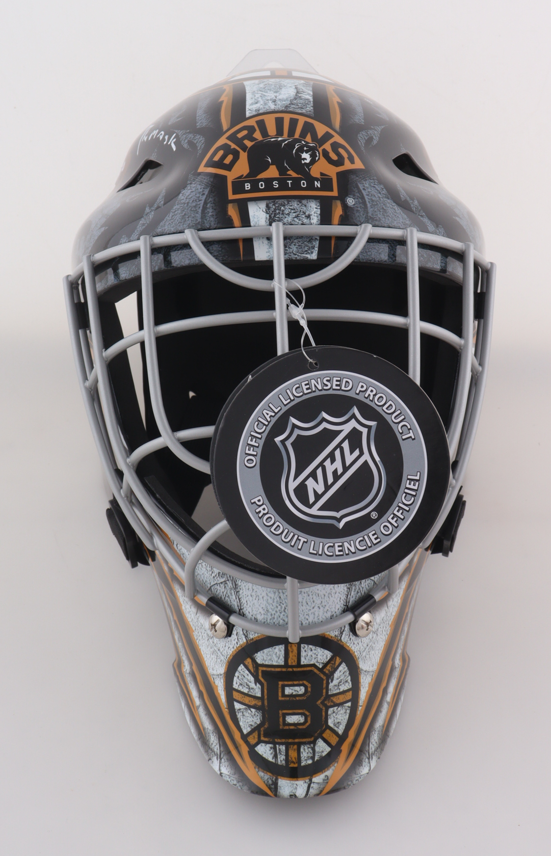 Franklin Boston Bruins Full-Size Replica Goalie Mask. Hand-signed and inscribed by Gerry Cheevers (HOF).