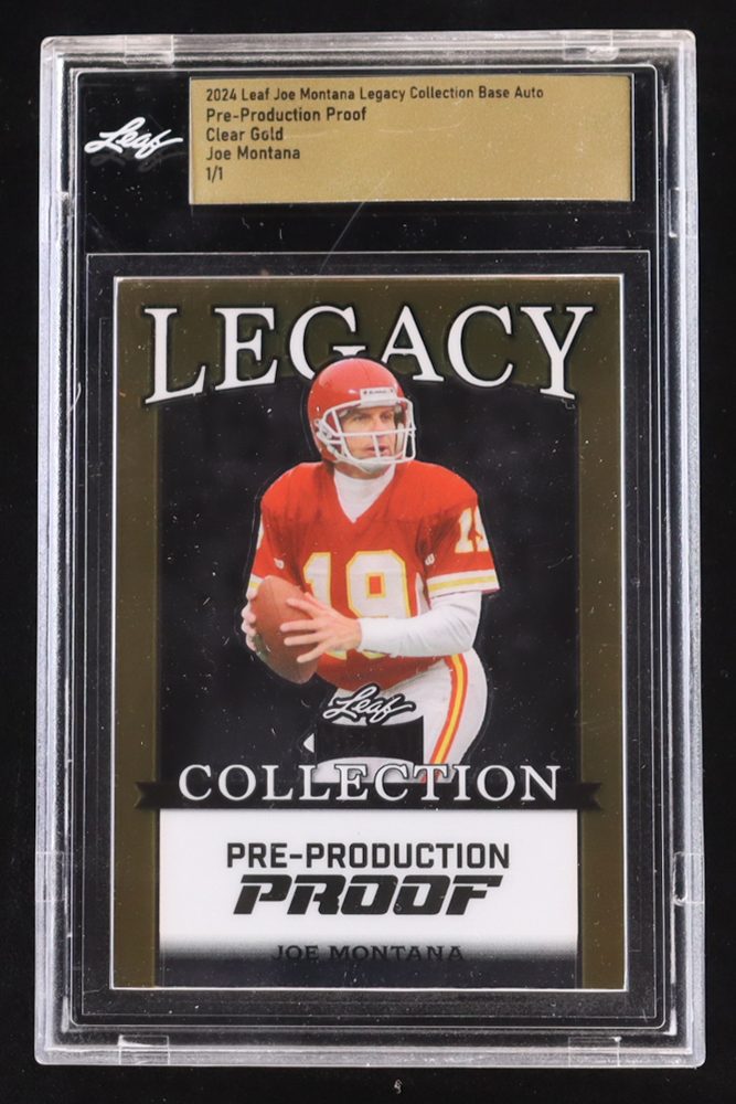 Joe Montana 2024 Leaf Joe Montana Legacy Base Auto Pre-Production Proof Clear Gold #NNO #1/1 (Leaf Encapsulated)
