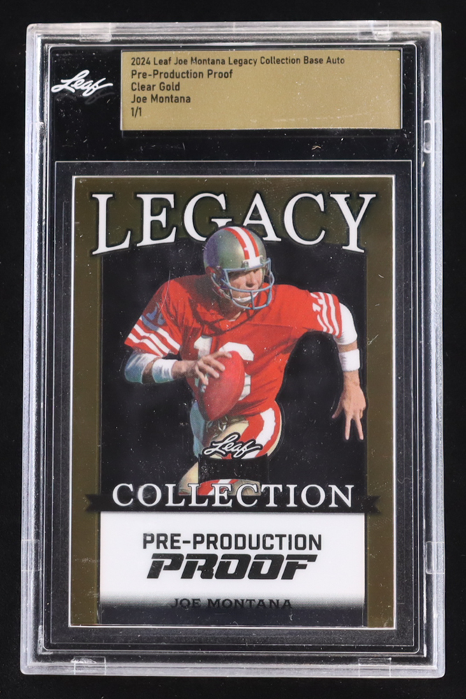 Joe Montana 2024 Leaf Joe Montana Legacy Base Auto Pre-Production Proof Clear Gold #NNO #1/1 (Leaf Encapsulated)