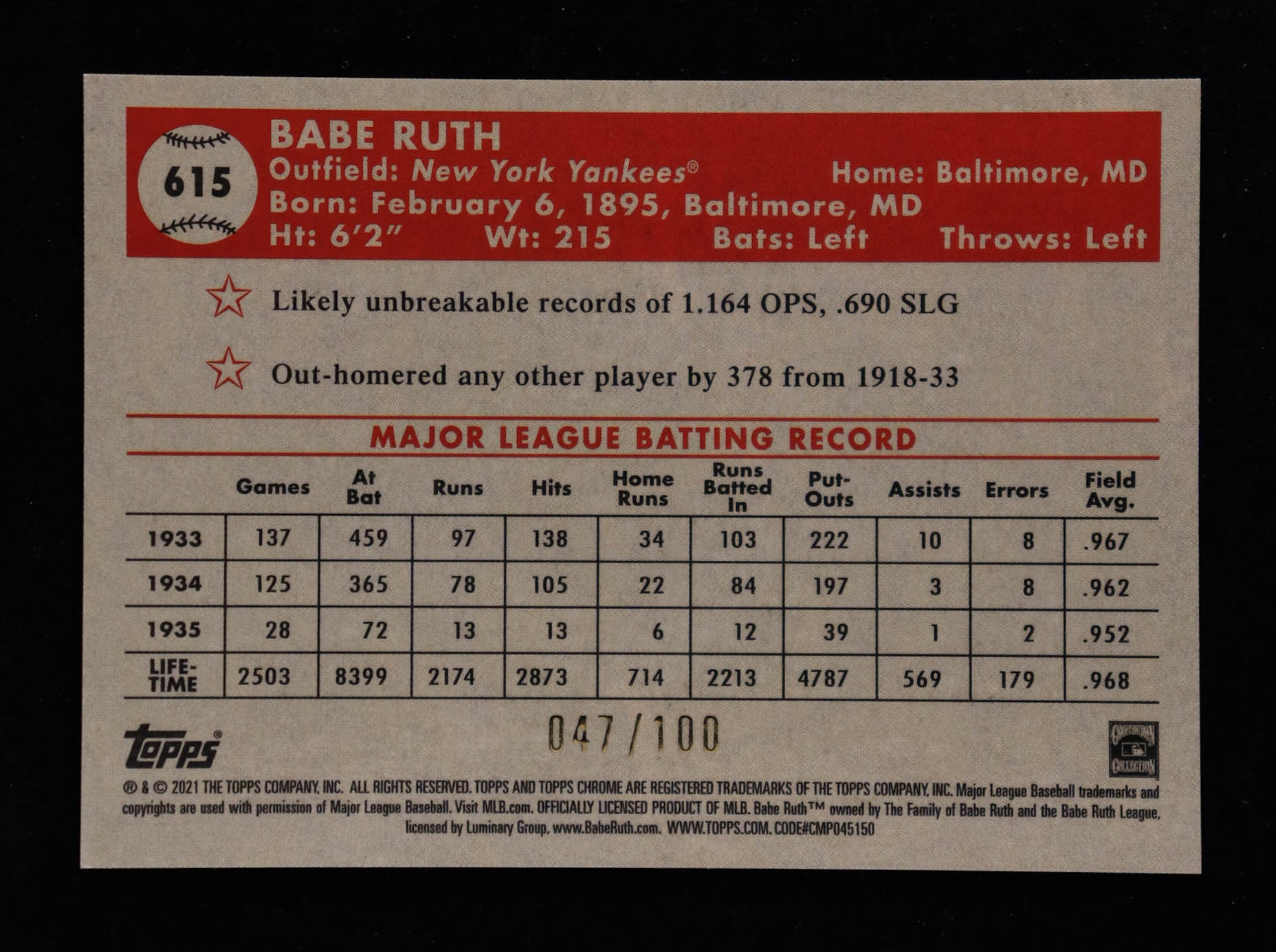 Babe Ruth 2021 Topps Chrome Platinum Anniversary Red Atomic Refractors #615 #047/100