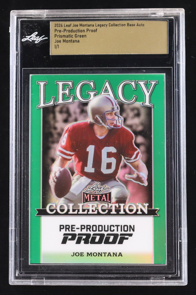 Joe Montana 2024 Leaf Joe Montana Legacy Base Auto Pre-Production Proof Prismatic Green #NNO #1/1 (Leaf Encapsulated)