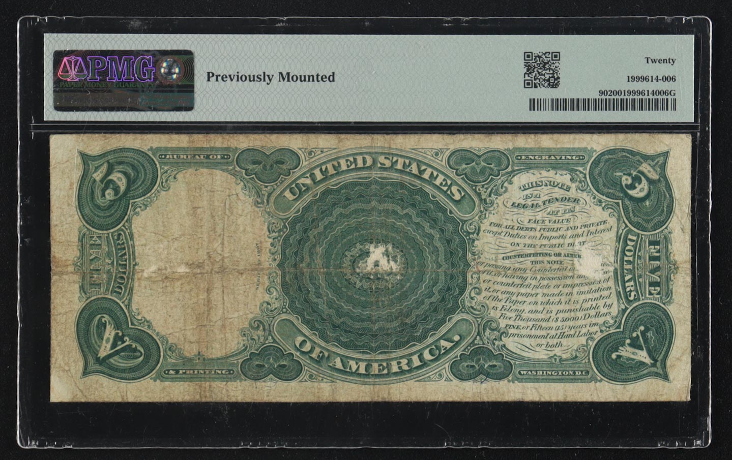 1907 United States of America $5 Five Dollar Note (PMG 20)