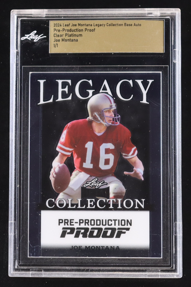 Joe Montana 2024 Leaf Joe Montana Legacy Base Auto Pre-Production Proof Clear Platinum #NNO #1/1 (Leaf Encapsulated)