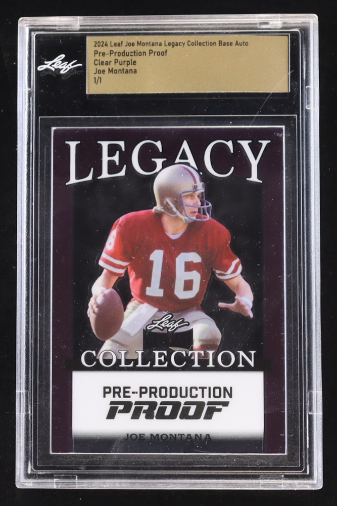Joe Montana 2024 Leaf Joe Montana Legacy Base Auto Pre-Production Proof Clear Purple #NNO #1/1 (Leaf Encapsulated)