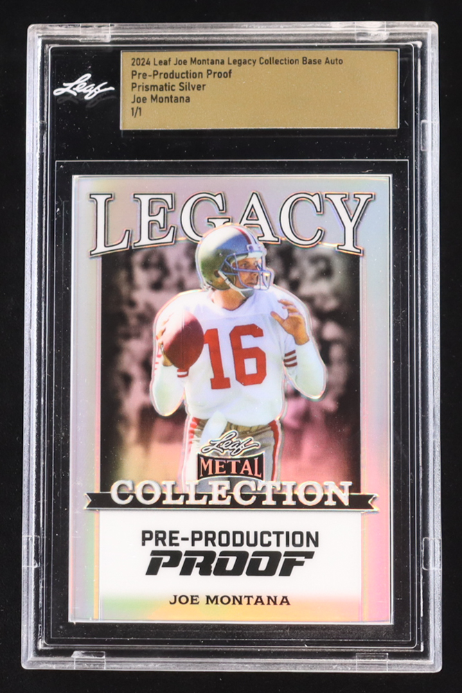Joe Montana 2024 Leaf Joe Montana Legacy Base Auto Pre-Production Proof Prismatic Silver #NNO #1/1 (Leaf Encapsulated)