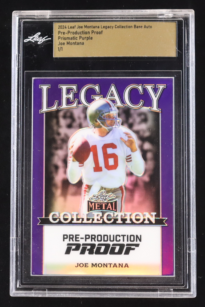 Joe Montana 2024 Leaf Joe Montana Legacy Base Auto Pre-Production Proof Prismatic Purple #NNO #1/1 (Leaf Encapsulated)