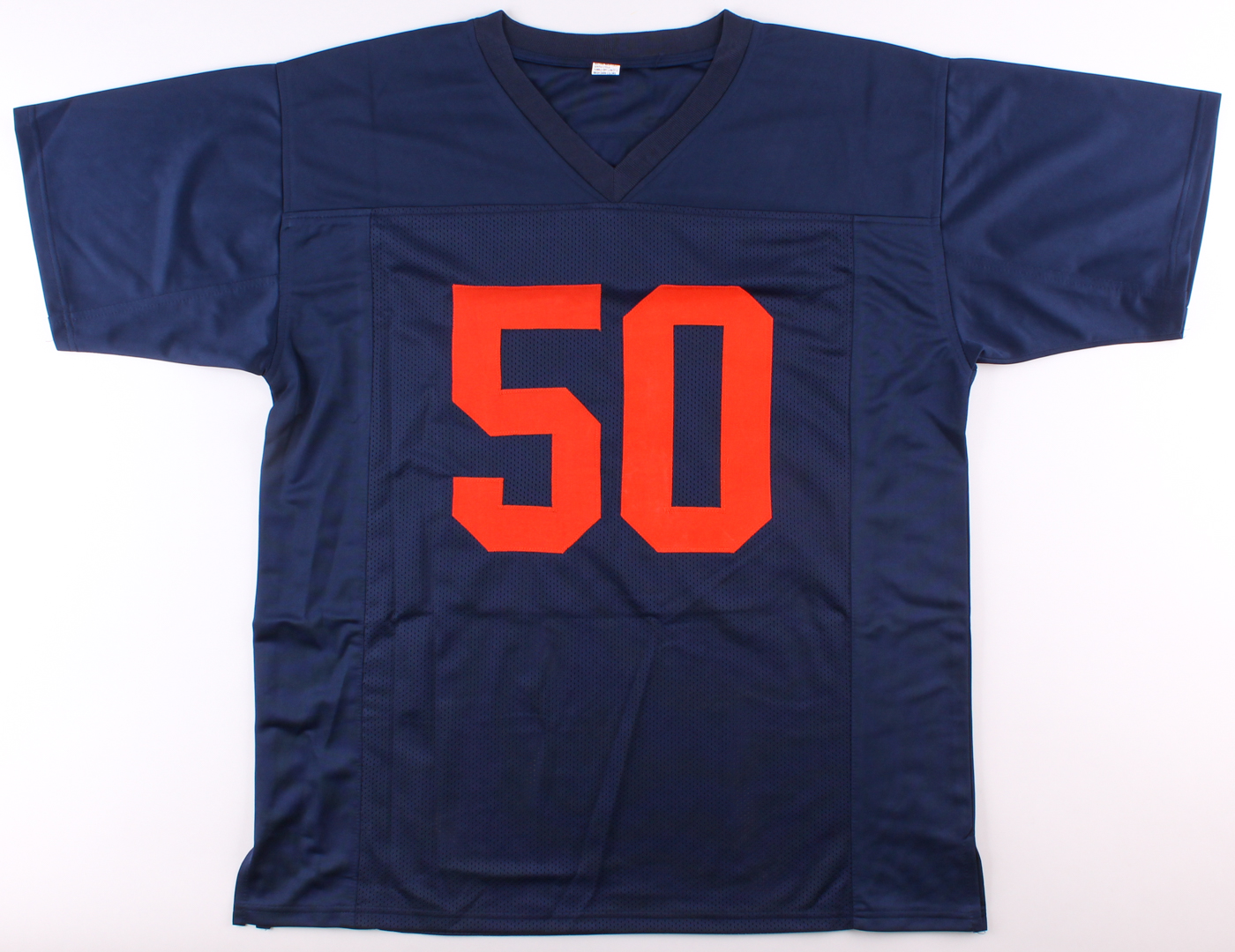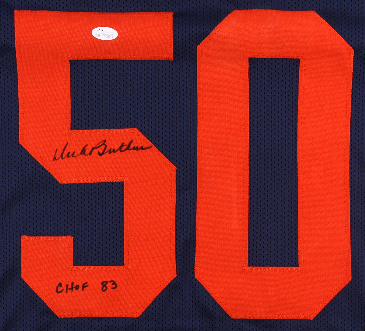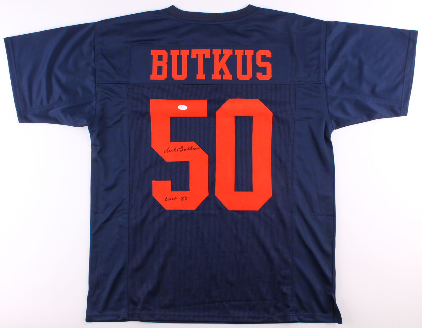 Custom on-field style jersey. Everything sewn on, size XL. Hand-signed in black felt-tip pen by Dick Butkus (HOF).