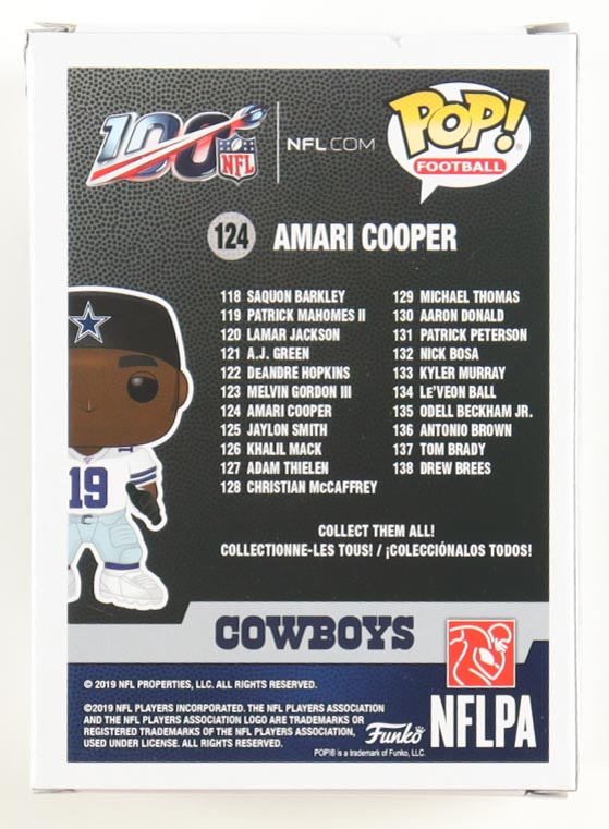 Funko Pop! figure measures approximately 4" tall and has been hand-signed on the packaging by Amari Cooper (Dallas Cowboys). Please note there is a dent in the front top part of the packaging.