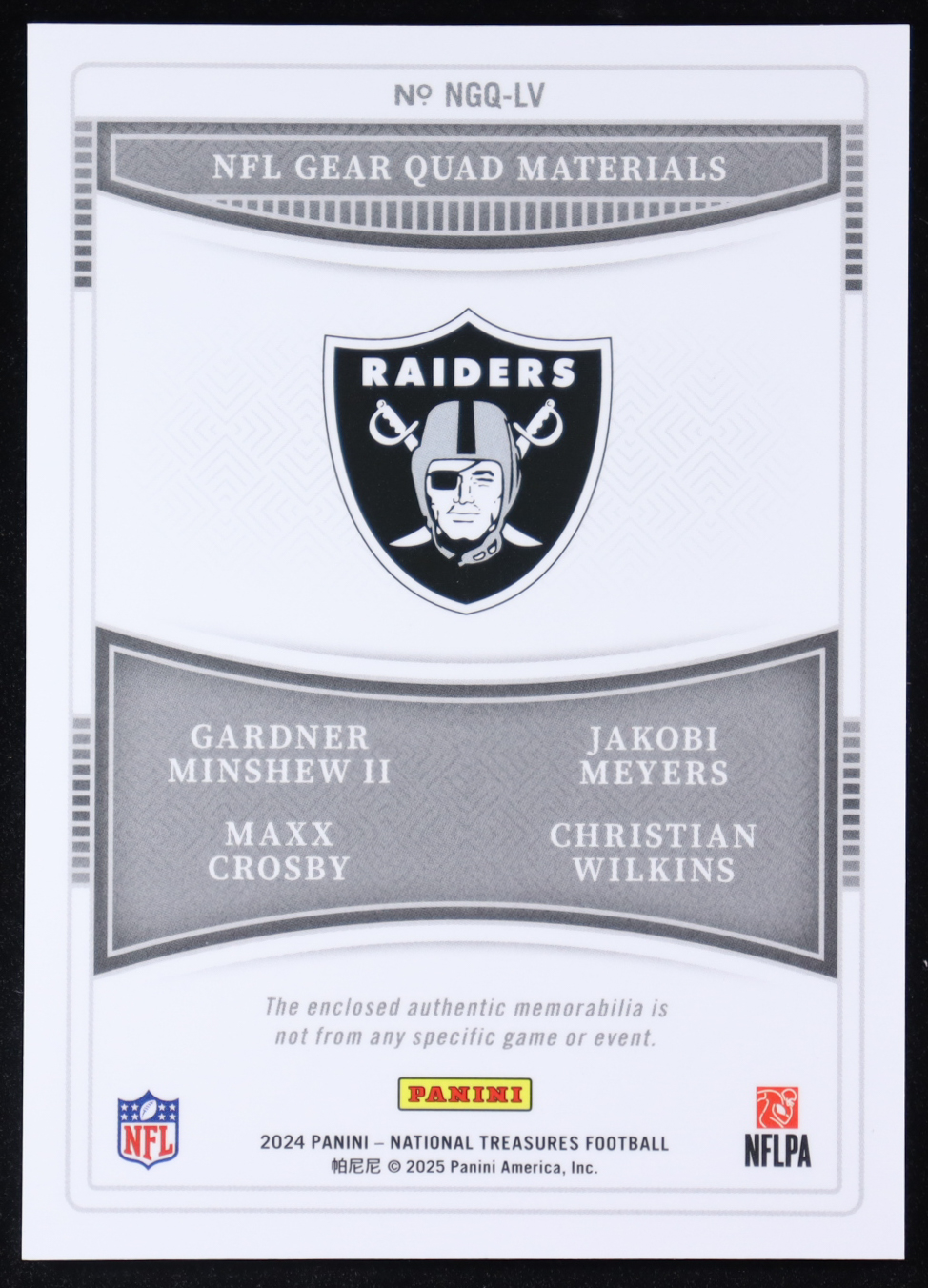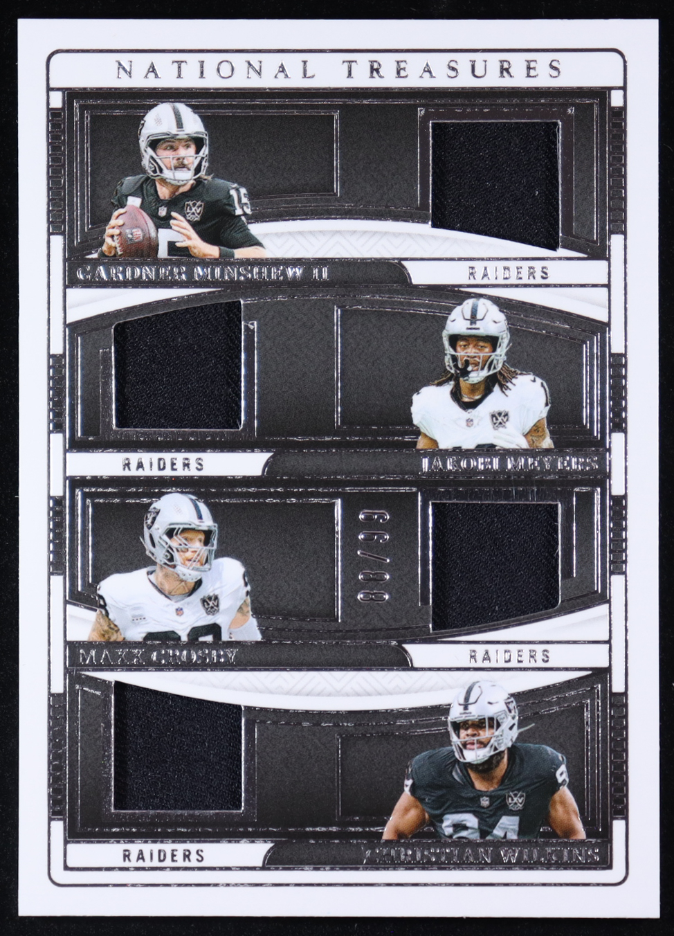 2024 Panini National Treasures NFL Gear Quad Materials #9 Gardner Minshew II / Christian Wilkins / Jakobi Meyers / Maxx Crosbys #88/99