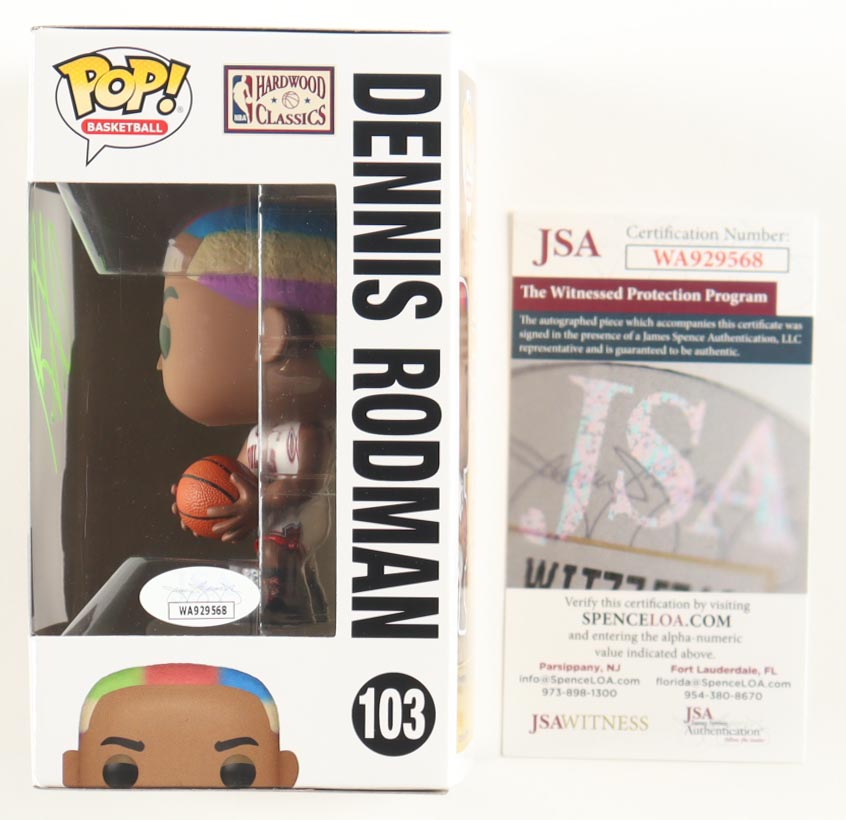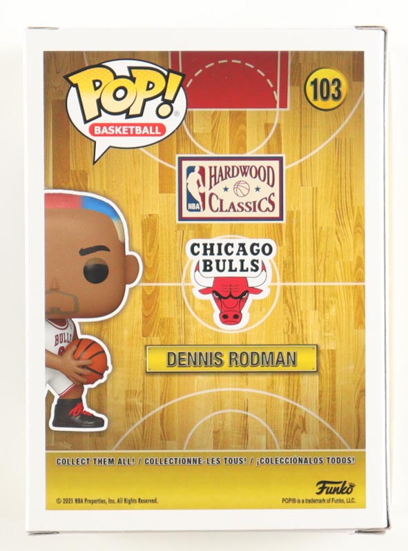Funko Pop! vinyl figure measures 4" tall and has been hand-signed on the packaging by Dennis Rodman (Chicago Bulls, HOF).