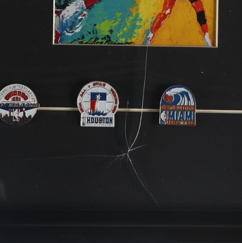 Custom framed display measures approximately 16.25" x 18.25" in size and features a set of (2) "Michael 'Air' Jordan" prints by LeRoy Neiman (D. 2012) as well as (5) Jordan All Star Game pins. Please note, the display is unsigned and the glass panel has been cracked. Please refer to photos regarding the condition of the item.