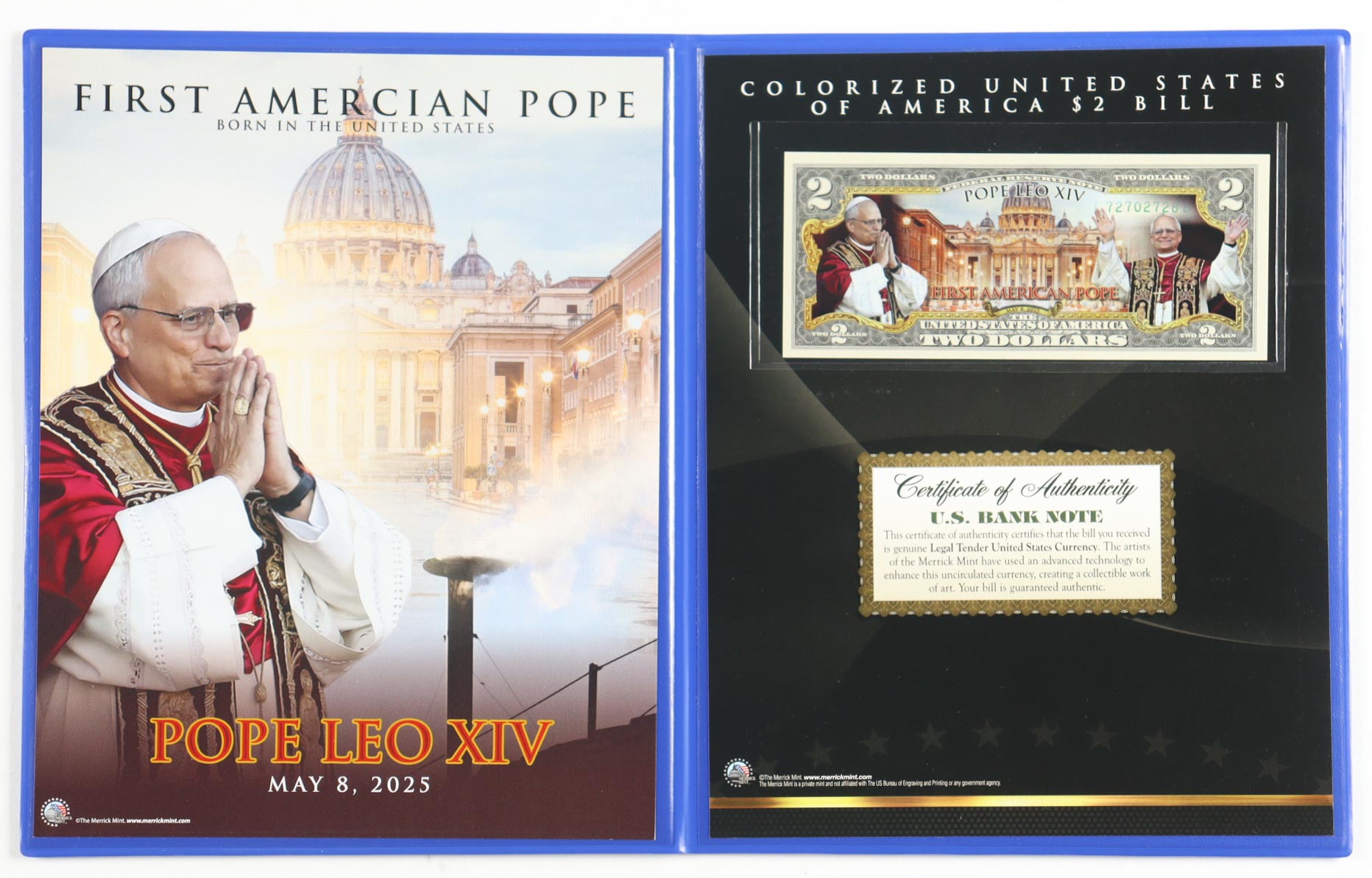 Pope Leo XIV Genuine Legal Tender Colorized U.S. $2.00 Two Dollar Bill Commemorative Edition Bank Note with Display Folder