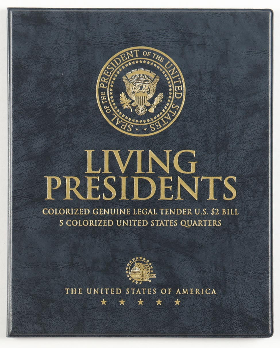 This Collectors Edition item includes a Genuine Legal Tender Authentic Colorized Living Presidents $2 Bill and 5-Coin Set, which features all five living U.S. Presidents: George H. W. Bush, Barack Obama, George W. Bush, Bill Clinton, and Jimmy Carter.