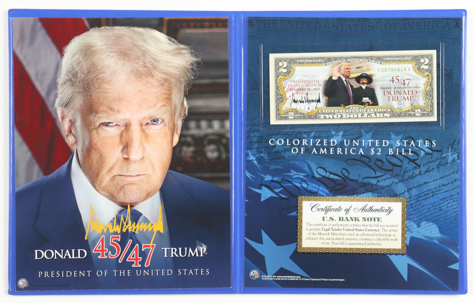 Donald Trump Genuine Legal Tender Colorized U.S. $2 Bill Commemorative Edition Bank Note. Includes folder as shown. Please note, the signature seen is a facsimile.