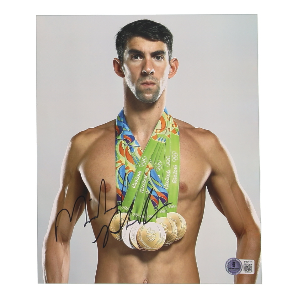 Photograph measures 8" x 10" in size. Hand-signed by Michael Phelps.