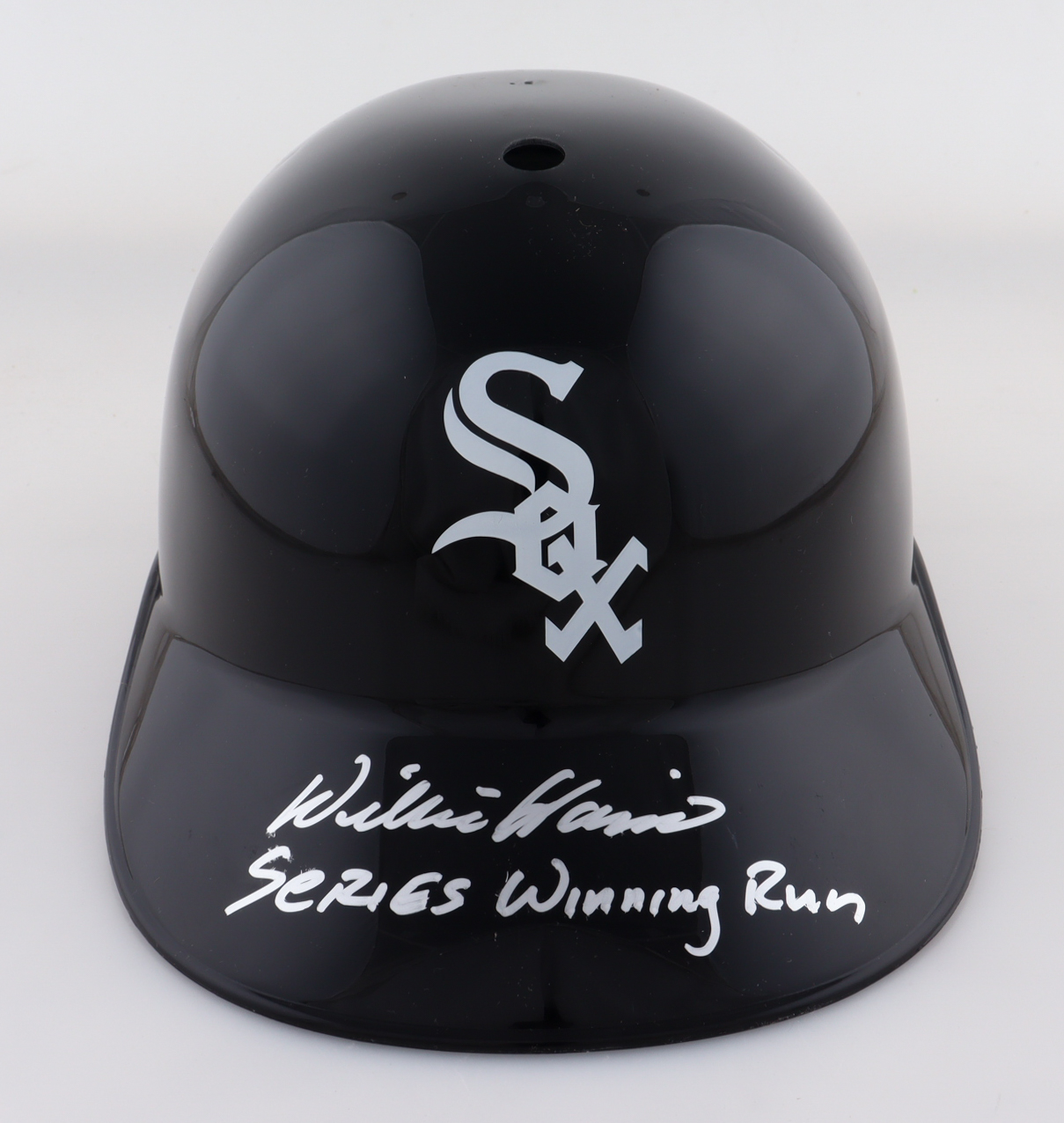 Chicago White Sox Full-Size Plastic Souvenir Replica Batting Helmet. Hand-signed and inscribed by Willie Harris.