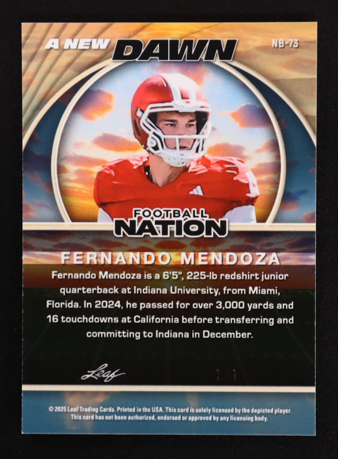 Fernando Mendoza 2025 Leaf Football Nation A New Dawn Blue Shimmer #NB73 #1/1