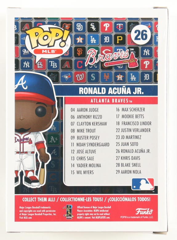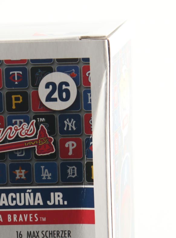 Vinyl figure measures approximately 4" tall and has been hand-signed on the packaging by Ronald Acuna Jr. (Atlanta Braves). Please note the window has been swapped and back right corner shows signs of damage.
