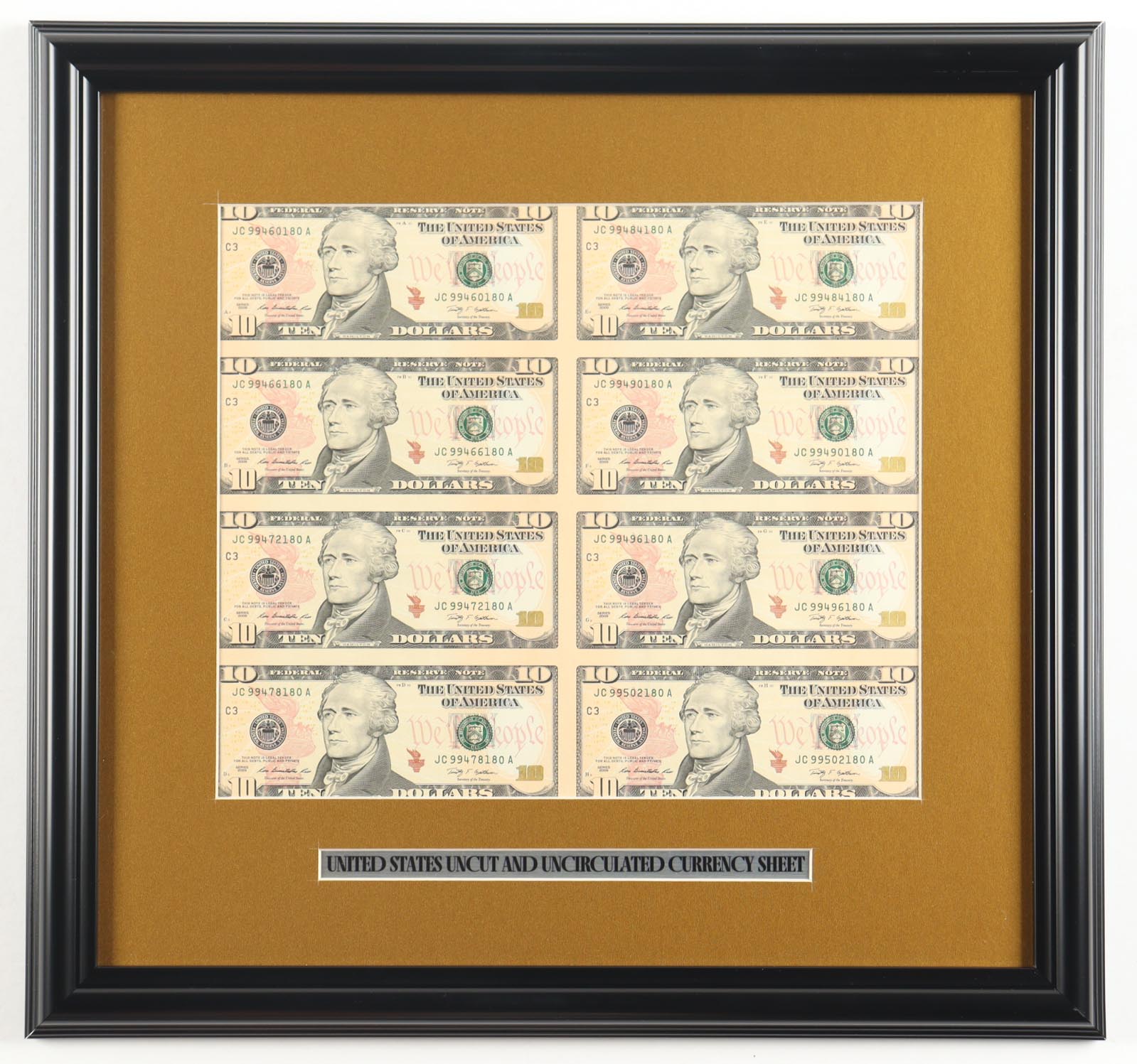 Custom frame measures approximately 17" x 18" in size and features an uncut sheet of (8) 2009 U.S. $10 dollar bills. Please note, the display is unsigned.