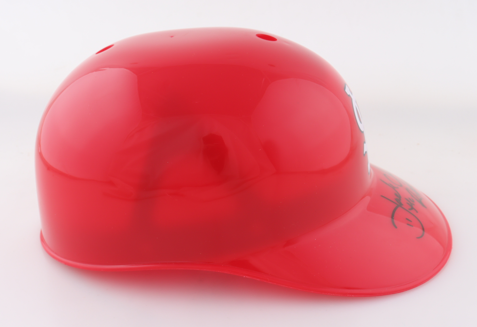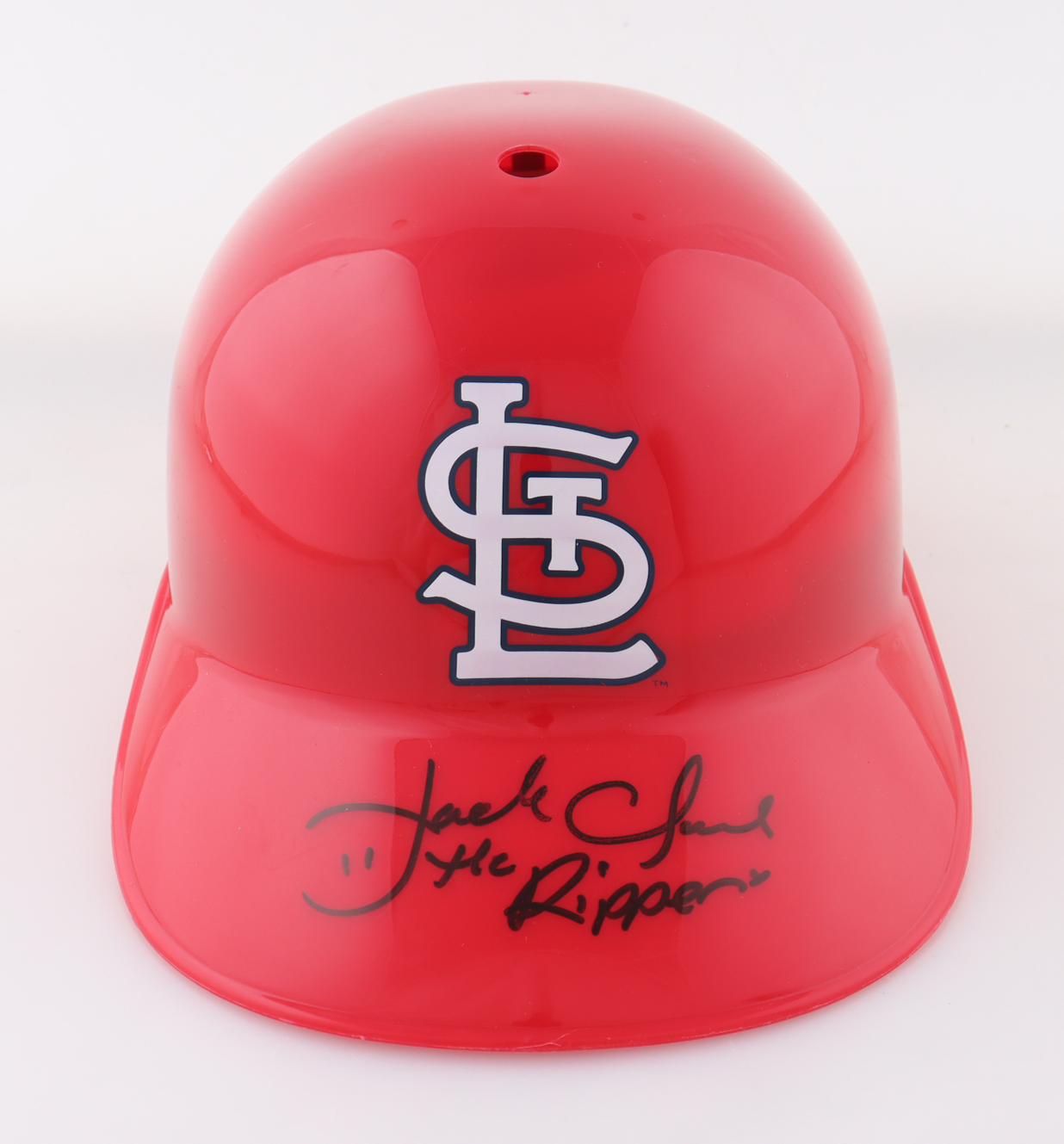 St. Louis Cardinals replica plastic souvenir helmet. Hand-signed and inscribed by Jack Clark.
