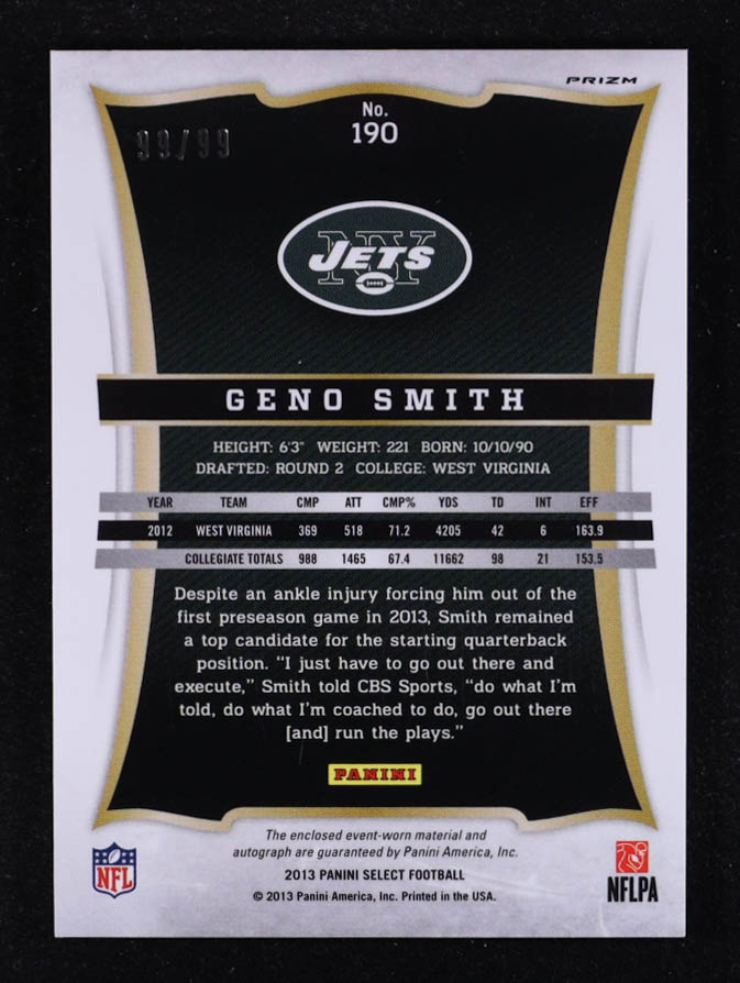 Geno Smith 2013 Select Rookie Jersey Autographs Prizm Event-Worn #190 #99/99 RC