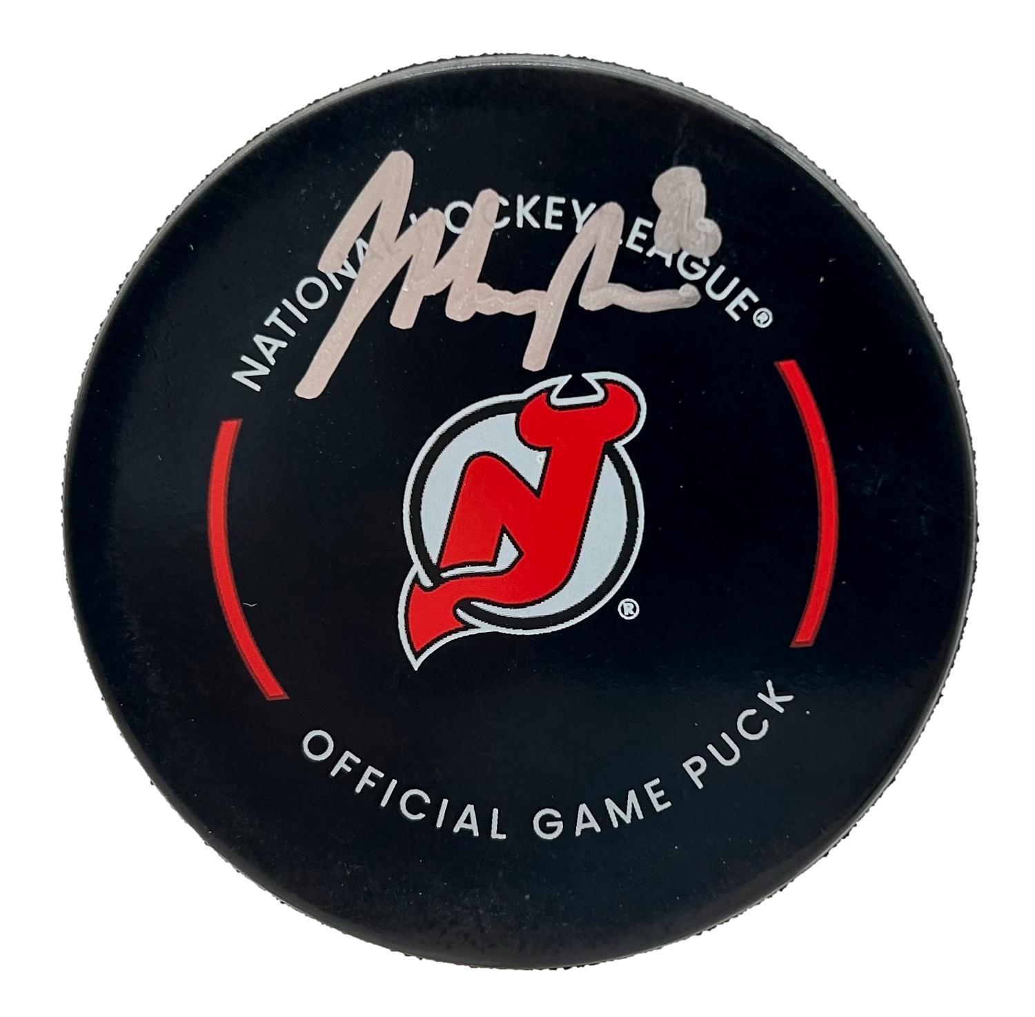 New Jersey Devils official game puck has been hand-signed by Jack Hughes.