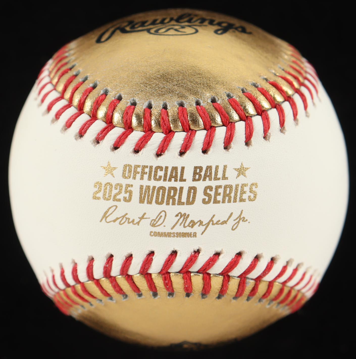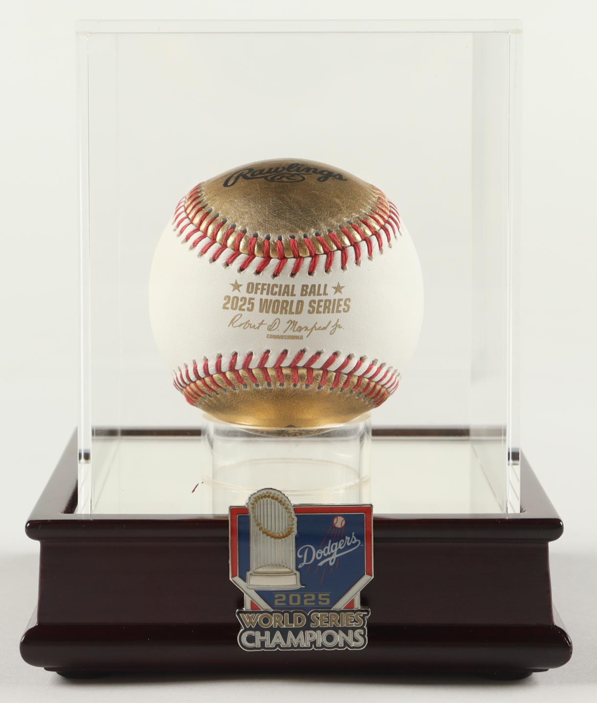 Rawlings Official 2025 World Series Gold Panel Leather Baseball. Note that the item is unsigned. Please see photos for more details regarding the condition of the item. The display case is included in the listing as shown above as well as the 2025 World Series pin.