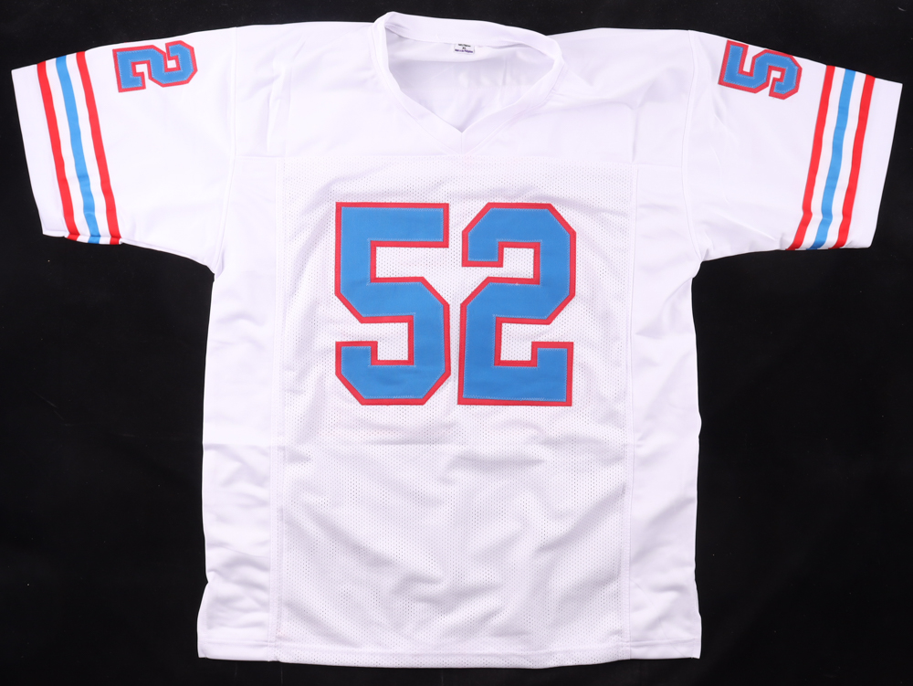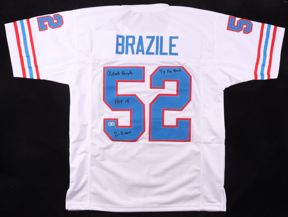Custom jersey with everything sewn on, size XL. Hand-signed and inscribed by Robert Brazile (HOF).
