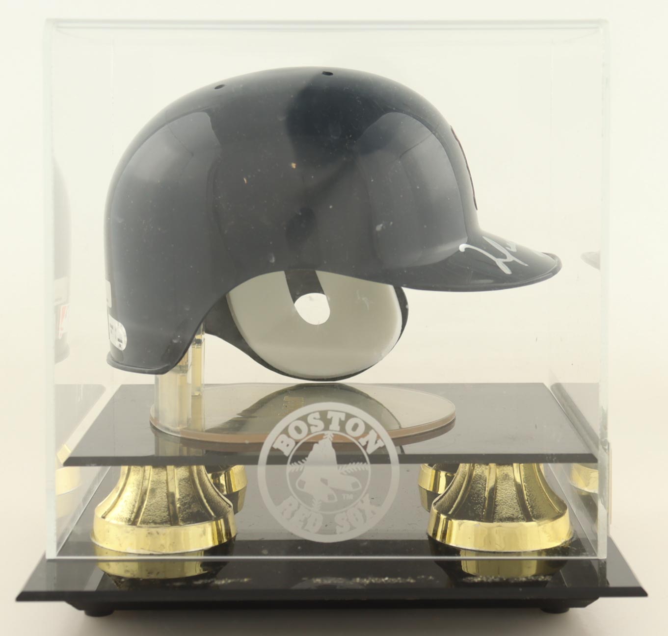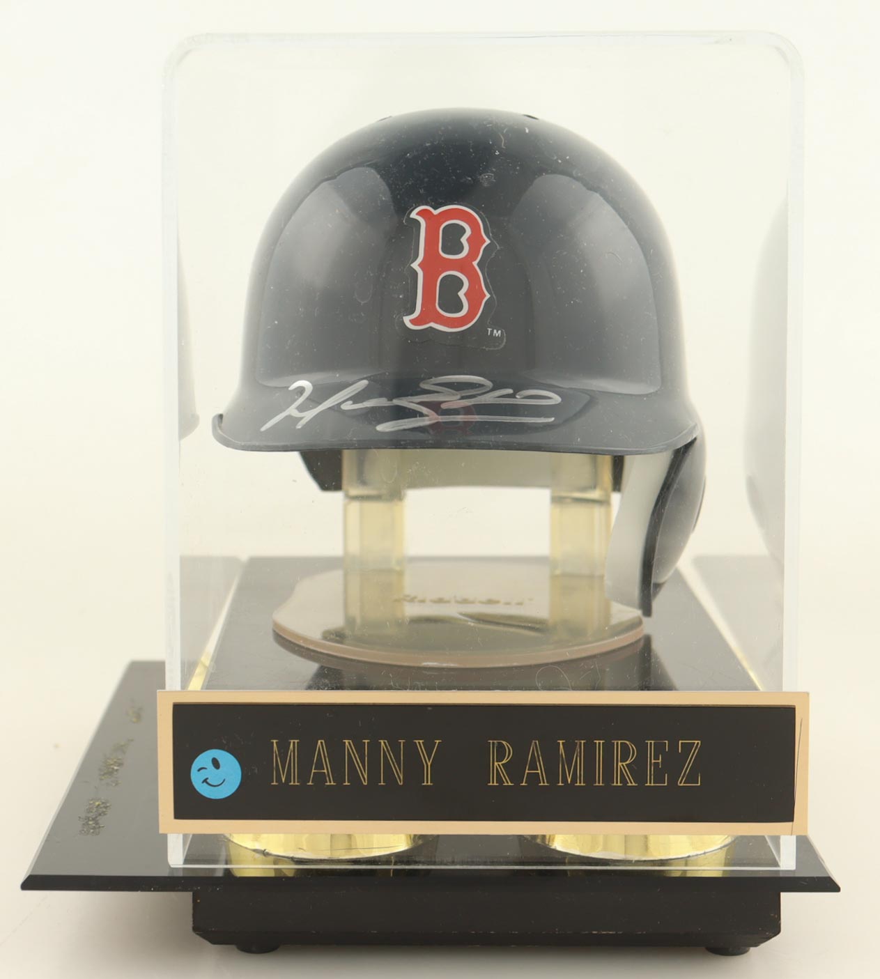 Riddell Boston Red Sox Mini Batting Helmet. Hand-signed by Manny Ramirez. Please note, the display case is included as shown.
