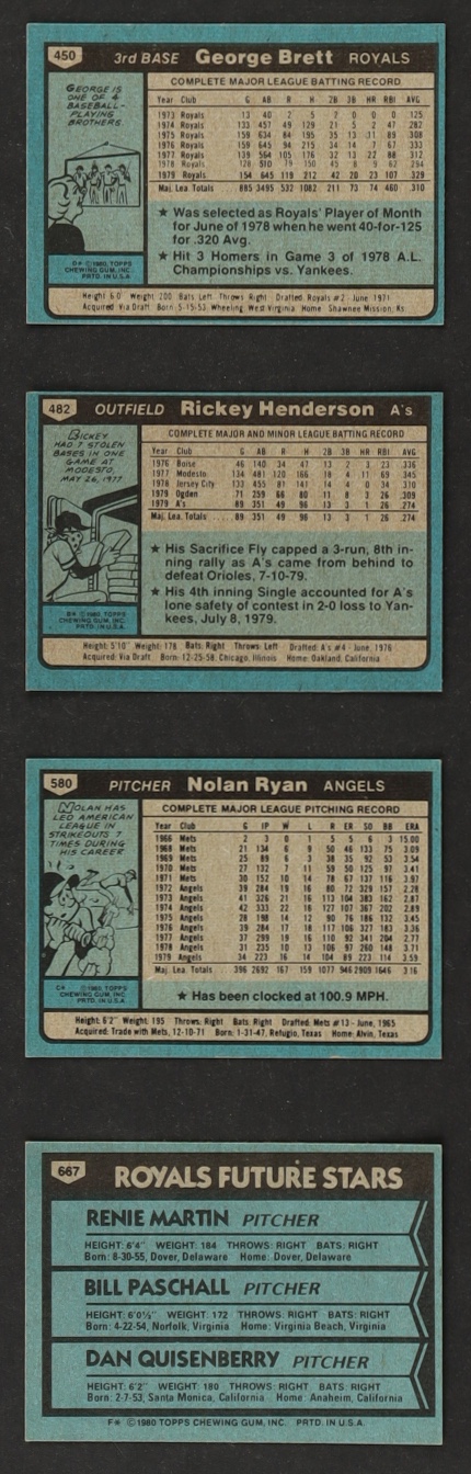 1980 Topps Baseball Complete Set of (726) Cards with Rickey Henderson #482 RC, Royals Future Stars #667, George Brett #450, Nolan Ryan #580