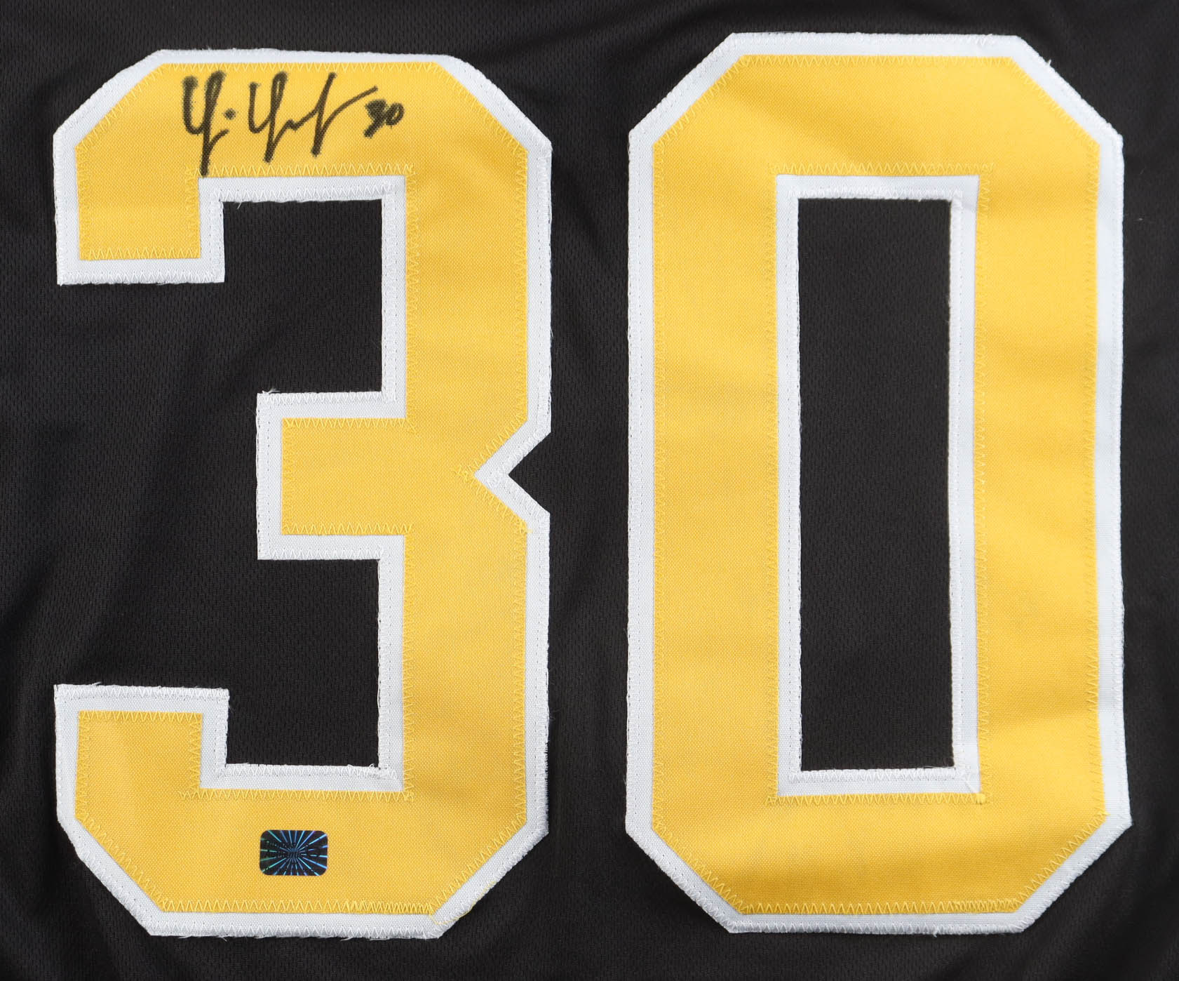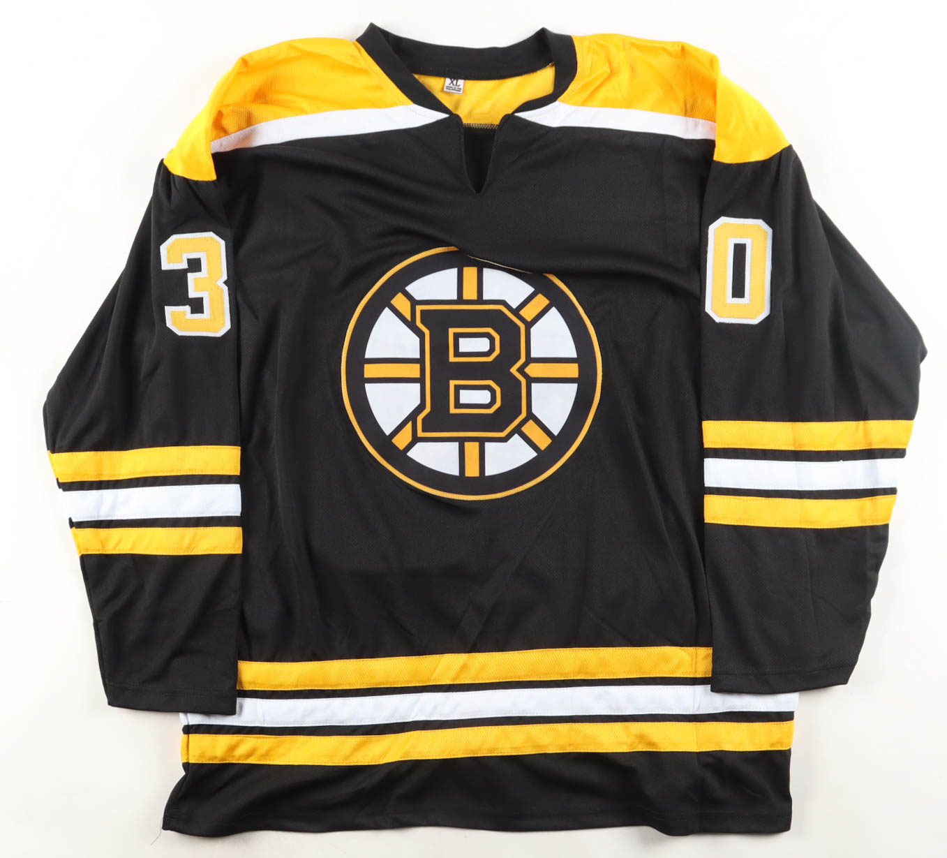 Custom jersey with everything sewn on, size XL. Hand-signed by Tim Thomas. Please note, the signature has bled.