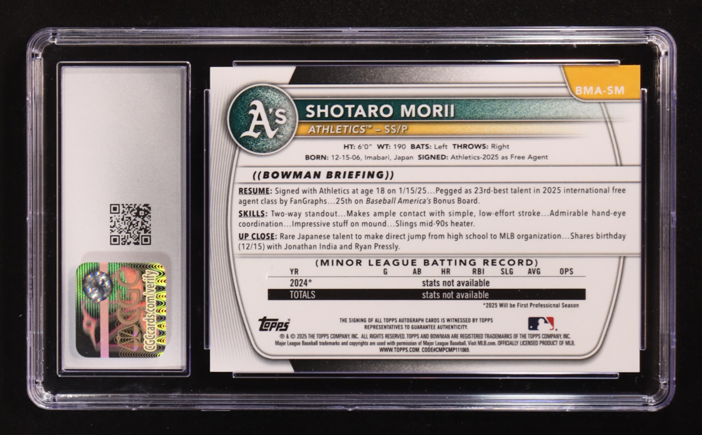 Shotaro Morii 2025 Bowman Chrome Mega Box Prospect Autographs Purple Refractors #BMASM #128/199 RC (CGC 9)