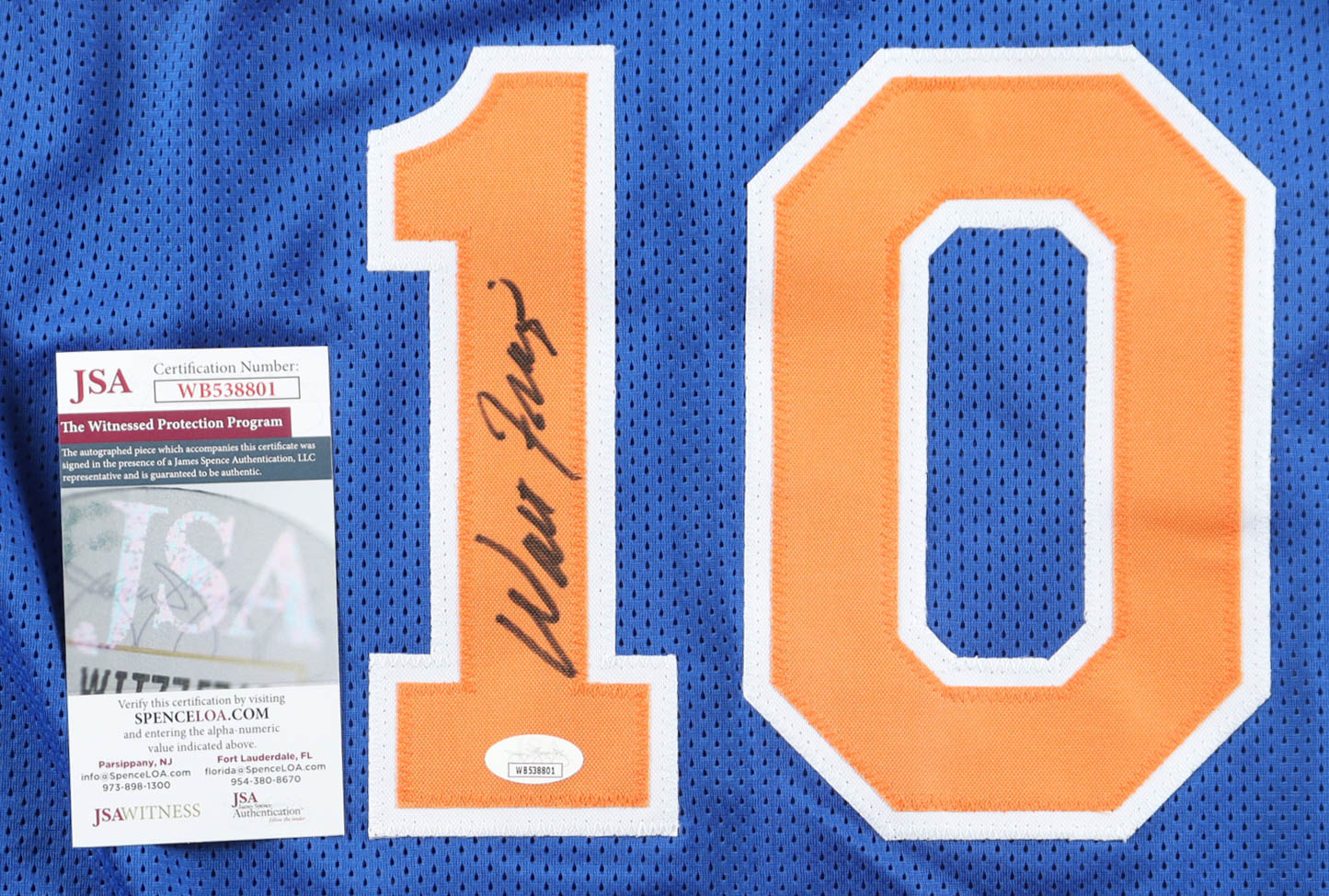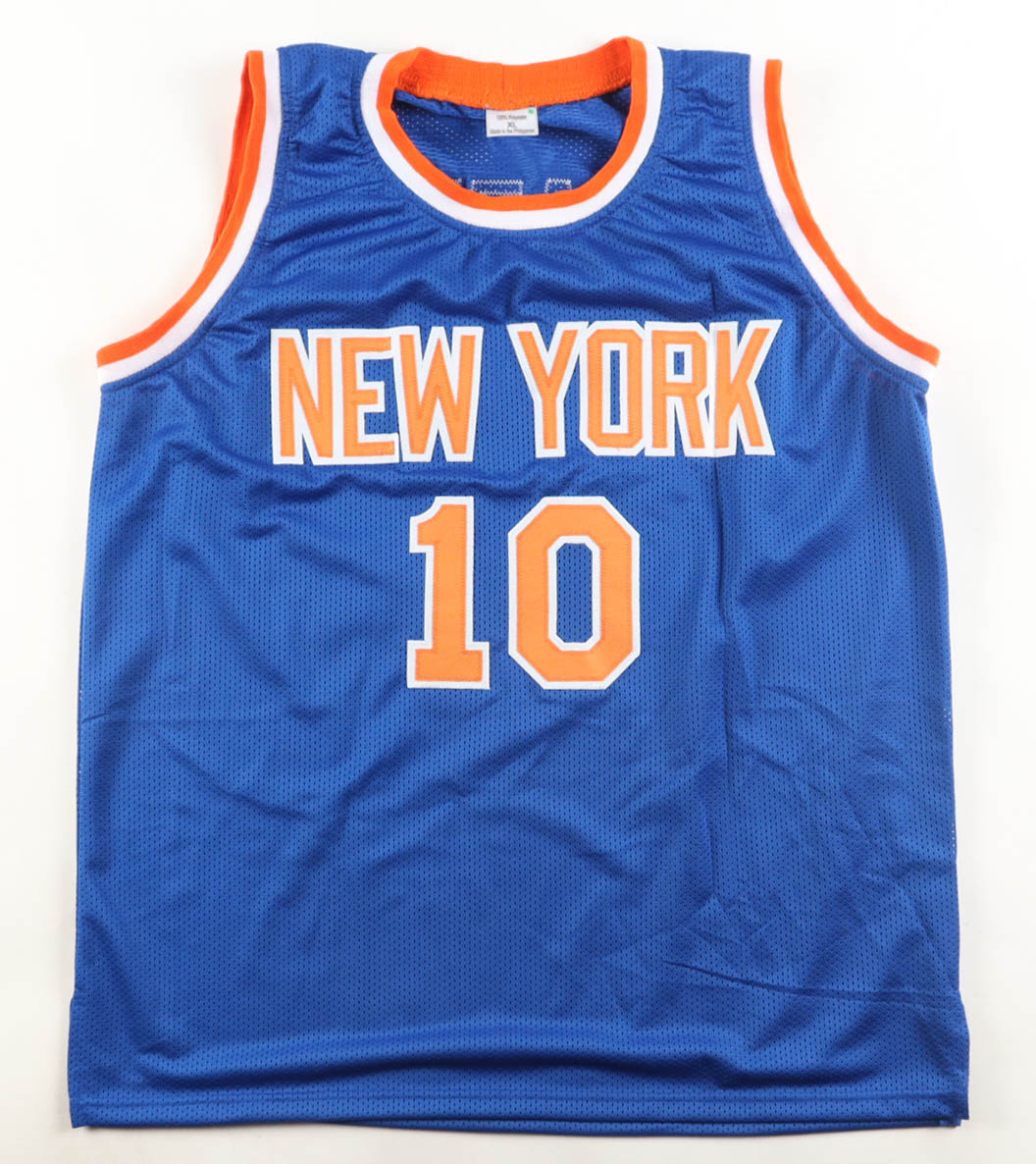 Custom jersey with everything sewn on, size XL. Hand-signed by Walt Frazier (HOF).