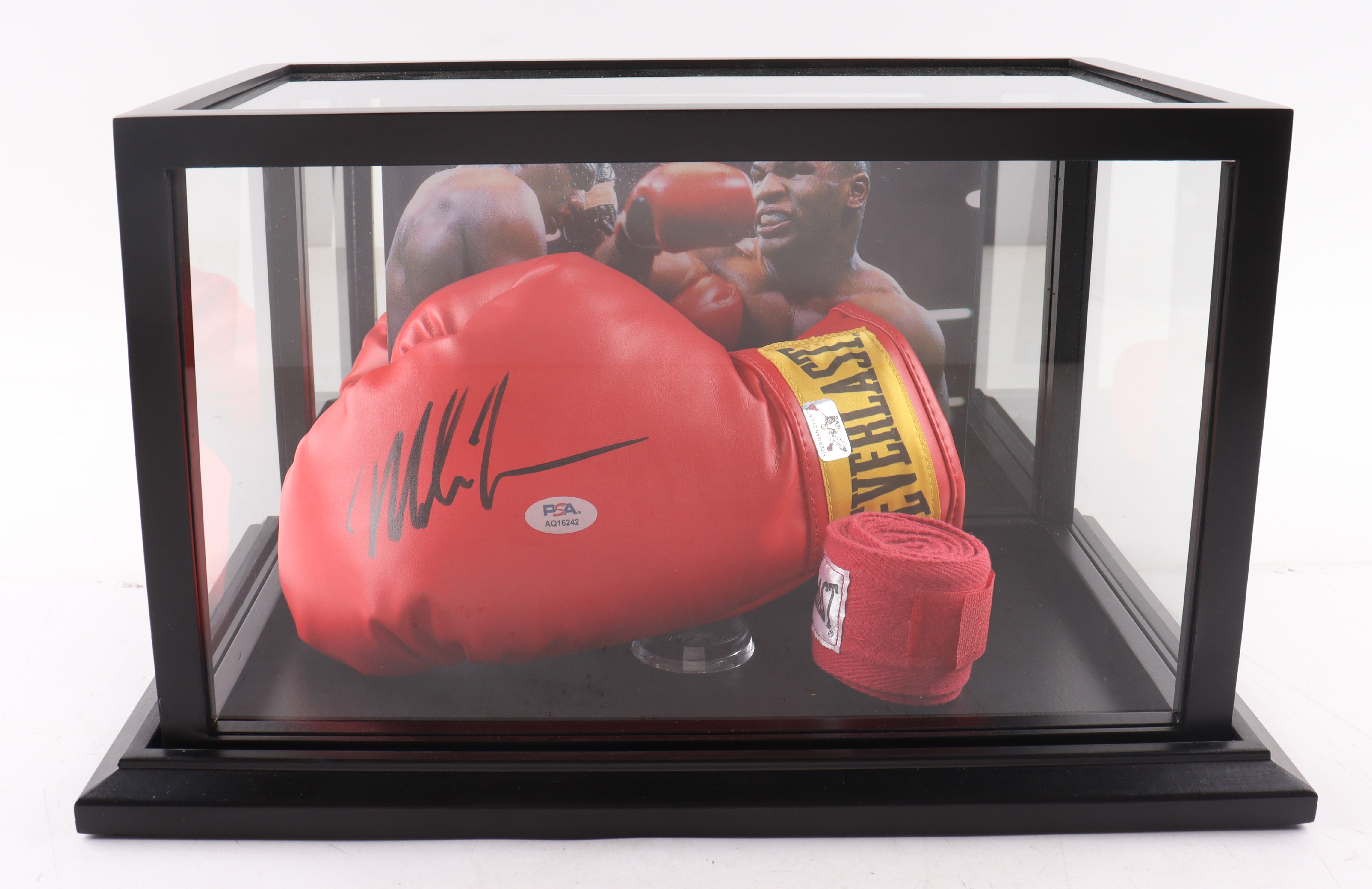 Mike Tyson Signed Everlast Boxing Glove with Red Everlast Wraps In Display Case (PSA & Tyson)