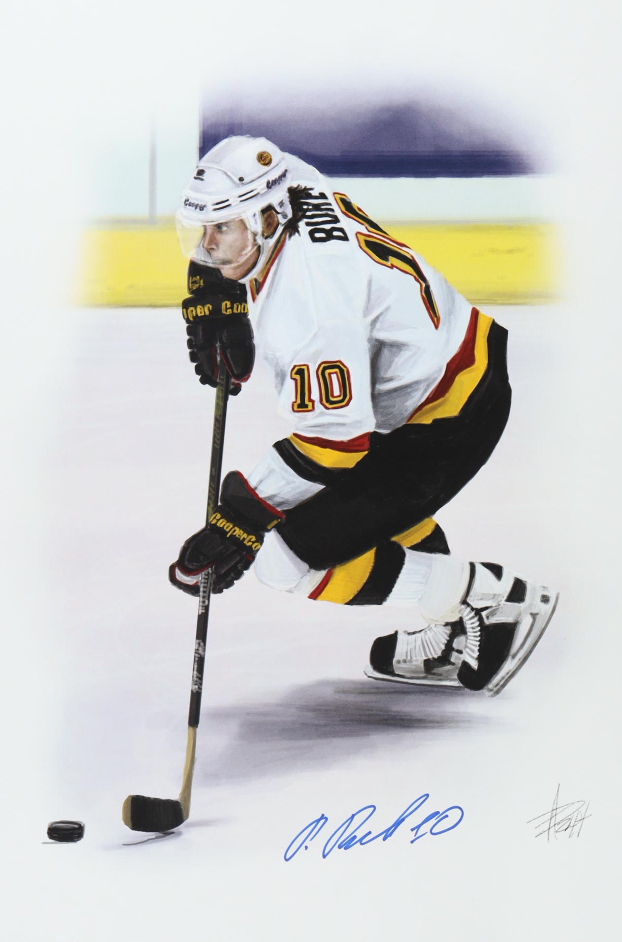 Lithograph measures approximately 12" x 18" in size. Hand-signed by Pavel Bure (Vancouver Canucks). Has also been signed by the artist Alex Douglas. Limited edition numbered #3/3.