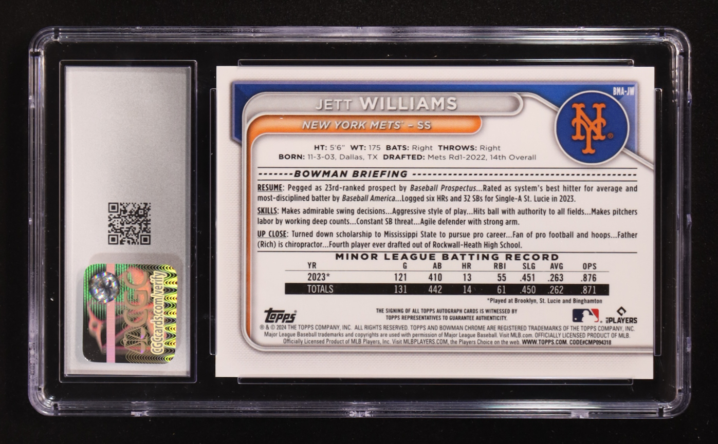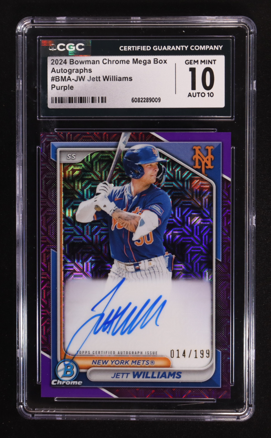 Jett Williams 2024 Bowman Chrome Mega Box Autographs Purple Refractors #BMAJW #014/199 (CGC 10)