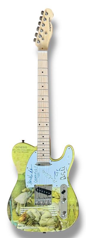 Custom Autograph Edition Telecaster style electric guitar measures approximately 39" in length and has been hand-signed on the pickguard by Peter Gabriel (lead Singer), Tony Banks (Pianist), Steve Hackett with "Genesis" Inscription (Lead Guitarist), and Mike Rutherford (Bassit).