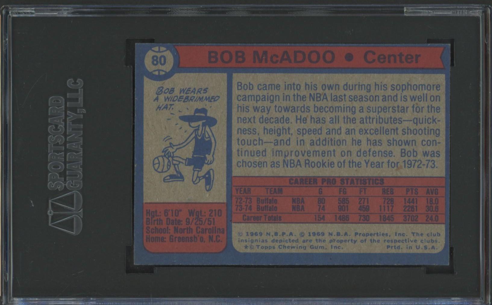 Card has been hand-signed and inscribed by Bob McAdoo (Buffalo Braves, HOF). Please see photos for details regarding the condition of the card.