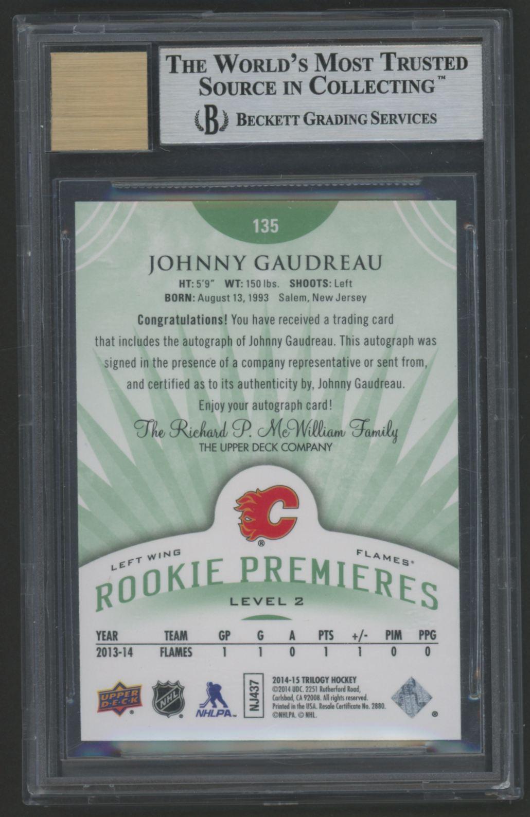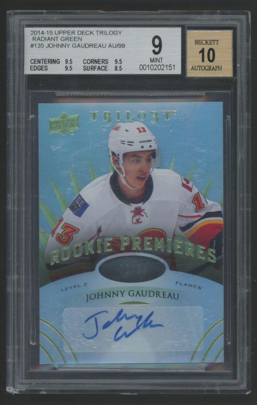 Johnny Gaudreau 2014-15 Upper Deck Trilogy Radiant Green Autograph #135 #71/99 (BGS 9 | Auto 10)